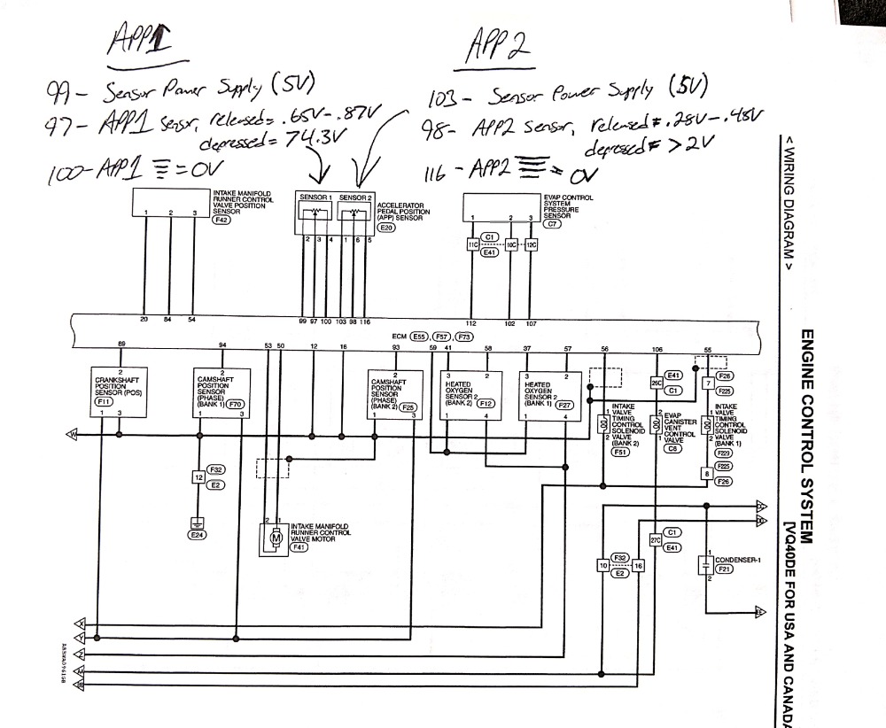 APP1 and APP2 have their own independent grounds and 5V ref as well. It was suggested that it may be heatsoak considering the sensor "behaves" for the first bit of use, and not until engine bay starts getting hot does it start to get erratic, possibly suggesting either a bad ground to the sensor or damaged wiring.