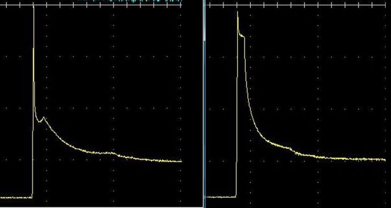 ...not the Maserati version, the REAL PLYMOUTH ACCLAIM/3.0L(ref. a scannerdanner video). My 90 year old ma's car with a little over 60,000 miles has developed a very bad bucking/stumble condition. Not sure what all is original on this vehicle, but before going to the usual parts cannon(plugs, wires, cap rotor, etc.)not to mention rigging up a fuel pressure gauge(no Schrader)...decided to make my first attempt into the scope world and tested injectors using the Hantek 1008c(yeah, I'm new). The following capture represents #4 injector on the left, while 1,2,3,5,6 pretty much being the same waveform on the right.