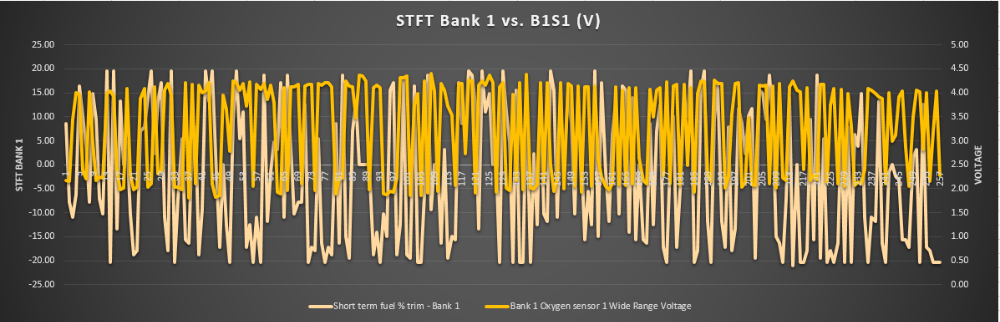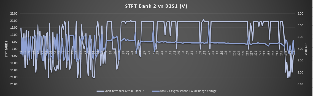 I haven't seen what is displayed on Bank 2 when a Wideband goes to bias 3.3 Volts, but the PCM puts the STFT through the roof! What a fueling strategy Toyota!!! But Clearly the PCM isn't seeing any activity from the O2 at this point.