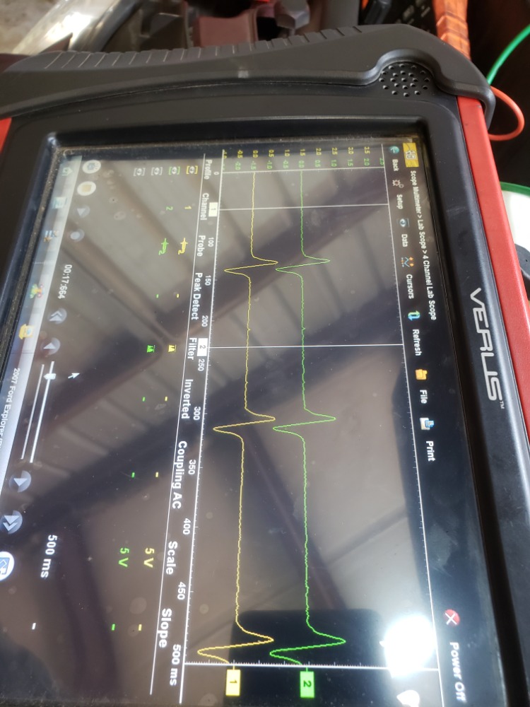 Did an in vehicle repair of the driver side timing chain, primary chain, and balance shaft. I used the special tools as required. After completing the job im having a harsh/violent start up. Almost like the timing is all off. Once starter it idles beautifully. In park the car revs just fine, However the car won't move out of its on way, it barely revs going up the road. It will also cut off sometimes when idling. When it shuts off its very violent like its being mechanically stopped. I went to to look at the cam/crank relation on my scope and wasn't getting a good cam signal (wish I took a pic). I disconnected the sensor and found no voltage on the positive wire key on or engine running. My ground looked good. This is a pull down design as far as I can tell. I started tracing back to the computer. While back probed at the computer and the sensor, I plugged sensor back in and picture below is what I found. Signal looks very weak, def low volts from everything else I've seen of other waveforms. My question is could this be my issue rather than a mechanical timing issue?