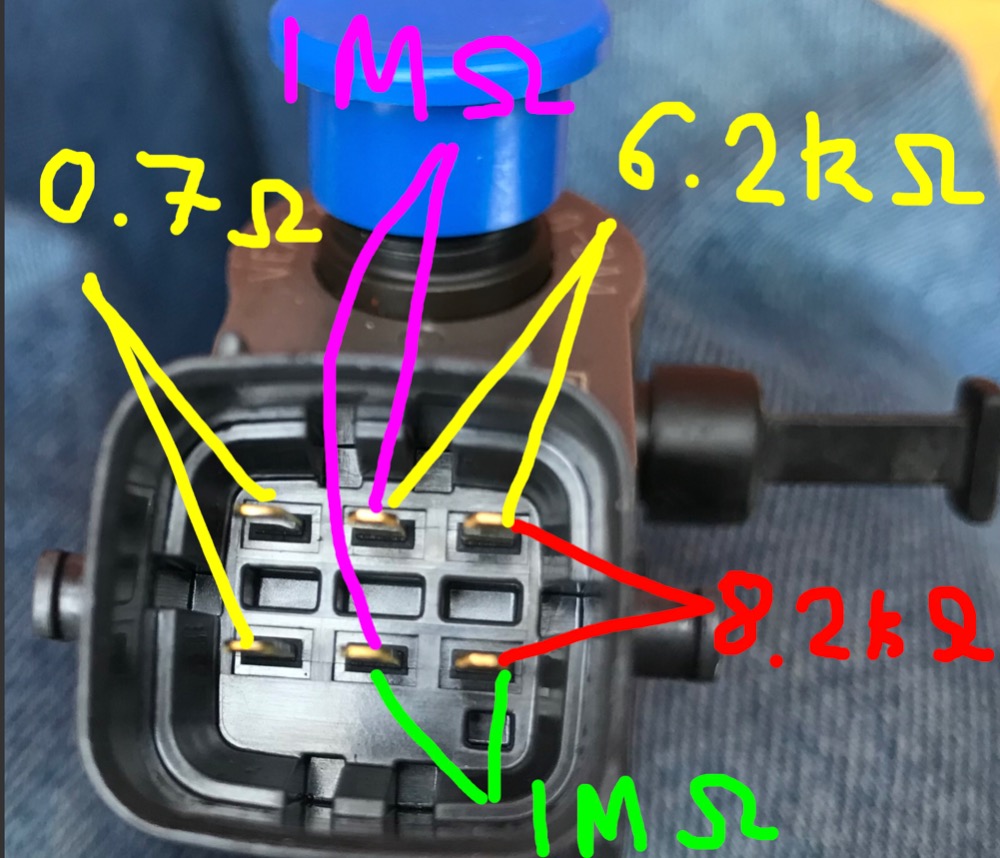 I get 0.3 Ohms across one, and 200k Ohm (after stabilising) across the other. Does that mean the 0.3Ohm injector is the coil type and the 200k is a ceramic stack? The larger 2 injectors have 6 connectors and I cannot find any explanation as to why there are 4 more connectors than I expected to see. I have measured the resistances and marked them on the photo.