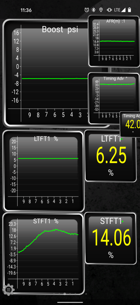 The only thing I can find that's peculiar is my LTFT. At idle, it usually hangs around +15-20% and drops to about 6% when driving.