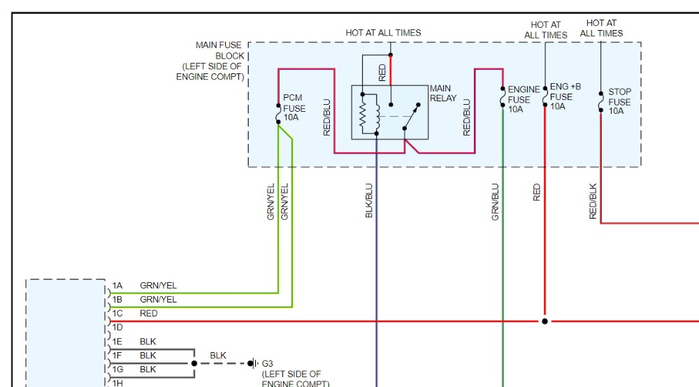 Start basic. I'd check PCM Fuse 10 Amp as well as Engine Fuse 10 Amp. Looks like the main relay provides power to both. See if you got power on one and not the other with the key on to start. That'll at least verify the integrity of the main relay, if nothing else. Also, I'd see if you can pull the relay and verify that the one terminal is getting power at all times.
