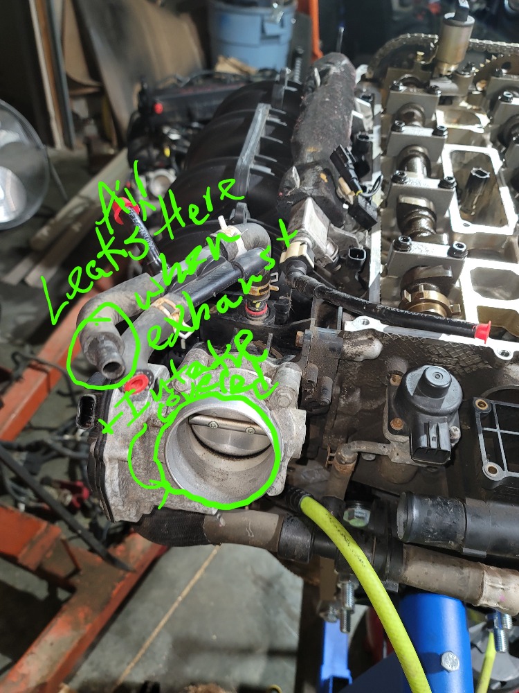 IF I put my hands over the intake and exhaust port it leaks out one of the line ports on intake side that eventually lead to the booster vacuum line if I'm naming it properly?(Photos Attached).