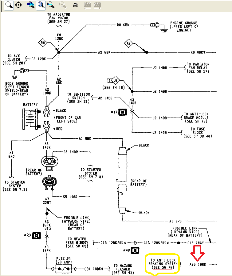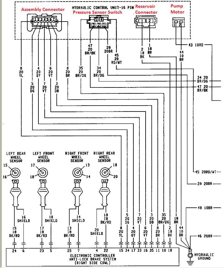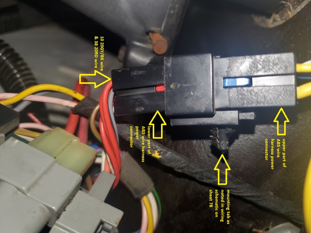 In an effort to provide some humor to this thread (hopefully not misunderstood humor), Lee Iacocca said to his electrical engineers "make a wiring schematic that is legible even when you take off your fire starting Coke bottle glasses!" The engineers accomplished this on sheet 78 (an updated pic has been attached to this post) when they depicted the wiring harness connector that provides power to the ABS electronic controller. On sheet 78, we can see the wiring harness (see Pic 2 attached this post) that provides power to the ABS control unit has been represented as opened - we can see both sides of the connector as the lower portion of the connector was facing up in your left hand and the upper portion facing up in your right hand. As per pic 1, we can see which cavity of the lower connector provides power to the ABS unit - note the position of the red (38 20RD) and grey/back (10 20GY/BK) wire - there be the power!!!