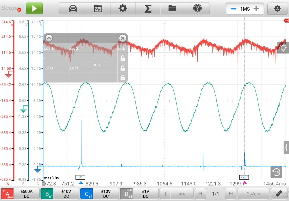 A delta sensor, First Look Sensor, like that. It's a canister with a piezo disk that's very sensitive to pressure changes. This is a known good capture taken off a '15 Equinox. Relative compression in red, intake pulse in green, #1 sync in blue.