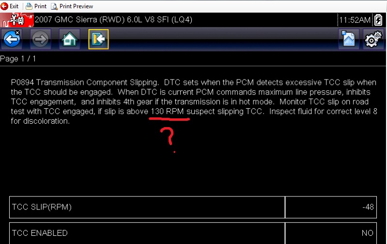 First is an '07 Sierra that came with a slippage code. Watched the TCC go into full lockup and never saw the slip PID go anywhere near zero. :lol: 200K+ miles on it, went with a rebuilt transmission. Worked perfectly afterwards.