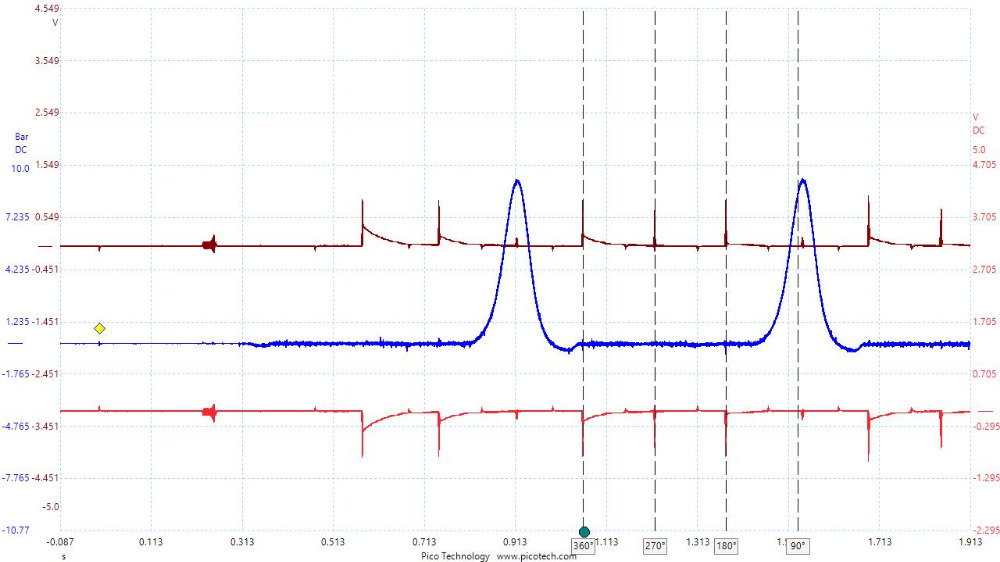 There doesn´t seem to be any pressure build up, but again this is just cranking, in my running waveform there is something going on that is very consistent with the exhaust stroke, i just dont know if it could be enough to cause this... I am fairly new with this tools but have already used my current setup to succesfully identify timing issues.