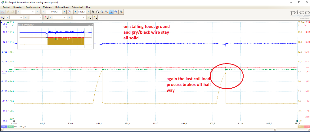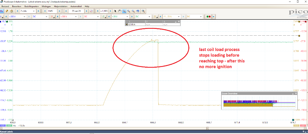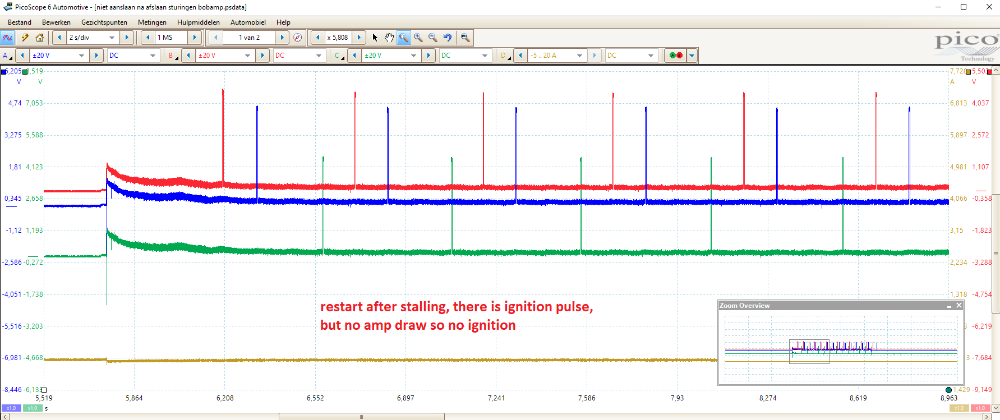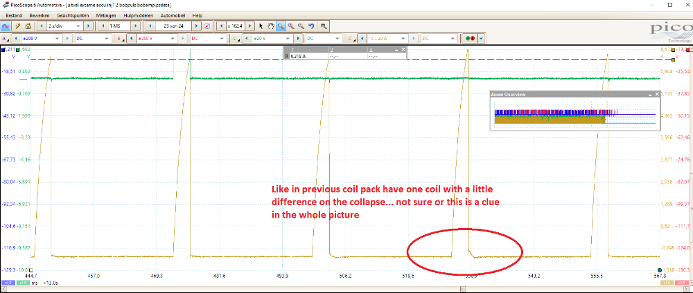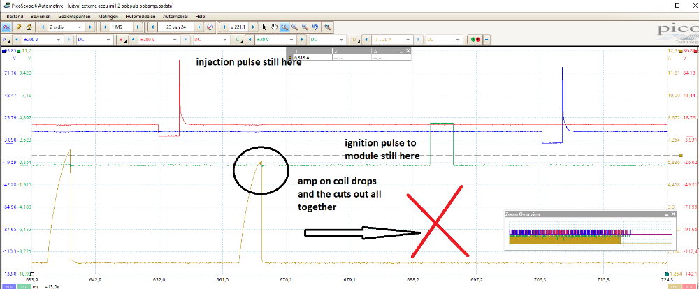 -- if I take connector off it will stall, no doubt, since the module is an overhead ignition coil for all 4 cylinders. But again; it's just the amperage (coil building field) that is gone, not the 4 pulses to time/signal them and also not the feed or the ground. It certainly looks like coilpack/module (1 item) but after 2 new ones and new sets of plugs I don't believe in such a thing (different brands also). Right now only 1 thing is most logic and that is a connector, even though it's not visibly and not to be replicated so far (it's the only thing between measured / scoped values and the failing coilpack/module). Only other thing might be engine heat inflecting on the coilpack/module?