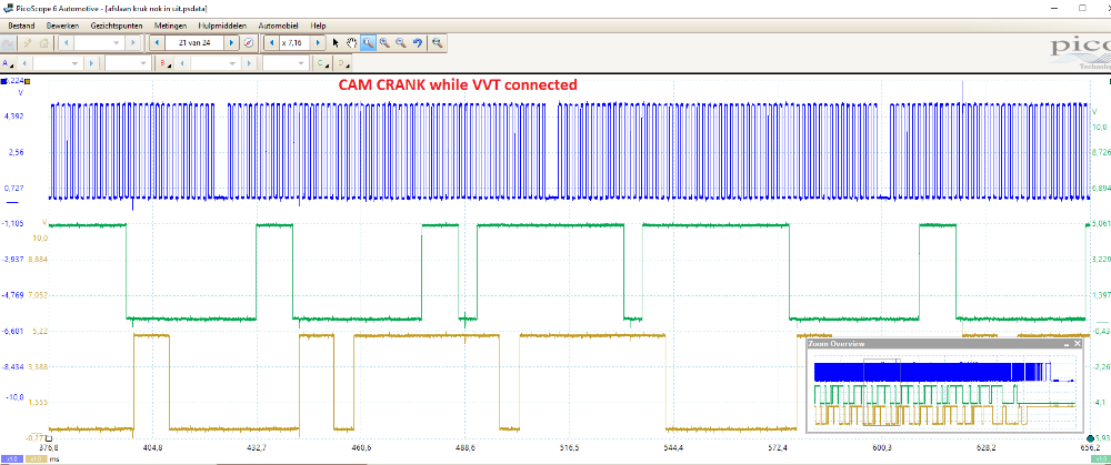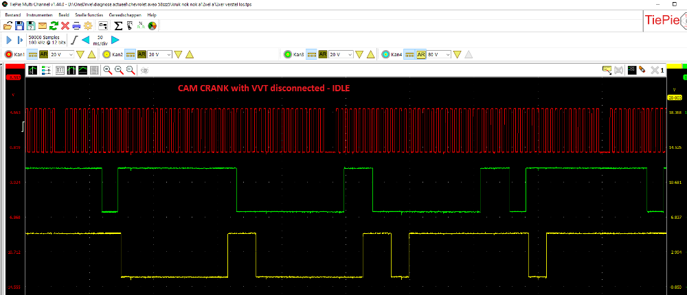 Timing have no good reference for this car, though with an Opel , also A12XER there is no difference vvt connected, taking in-/out vvt connectors off, it's not ok. Also seeing about 50 percent VVT adjustment on idle, which seems weird to me? Gas test tells me lambda works fine and trims are within 10% long and short together (nothing special). On stalling while scoping timing did not see obvious changes before stalling. Still need to record live data MAP etc while stalling but since injection pulse don't change before stalling no big suprises to be expected. Connector coil checked visually and wiggled, no change in scope images but still on the cards.