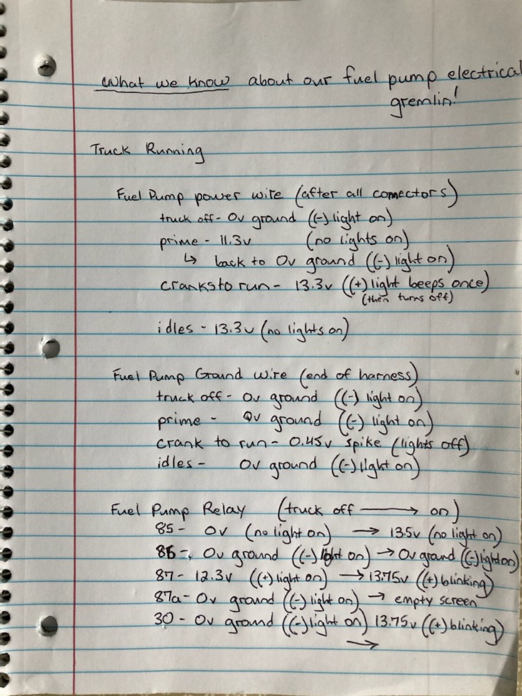 I'm reading 60 psi prime, then 55 psi idle and drive and getting 13.3v at the pump power wire