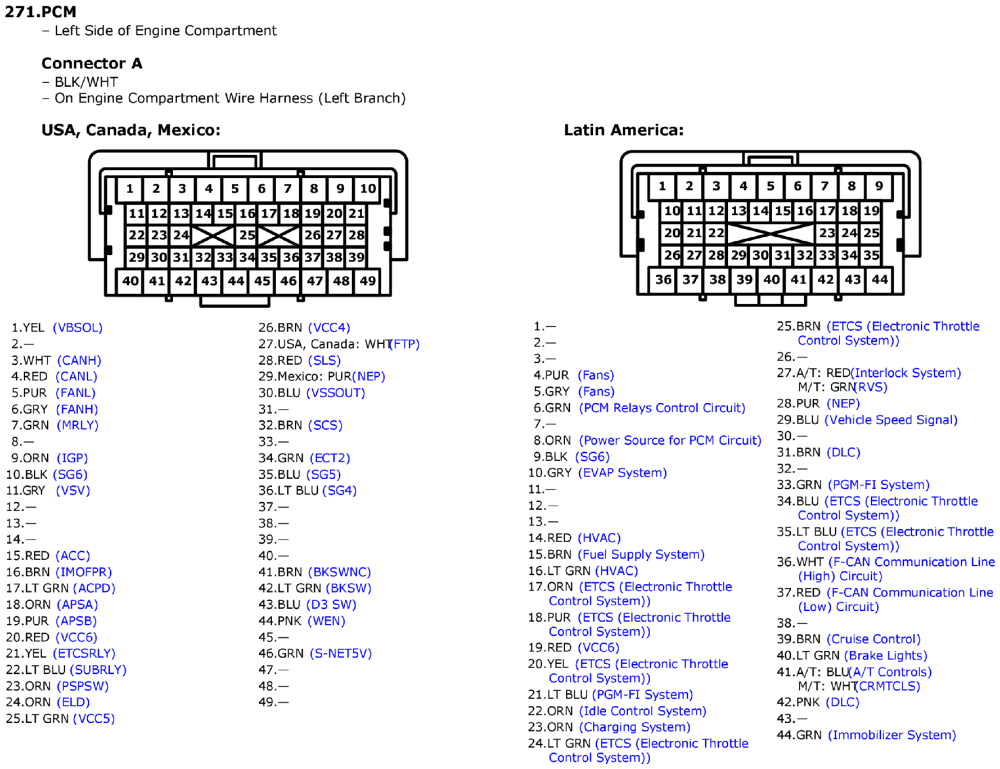 Left side of Engine Compartment. I have NA version selected in identifix and it's giving me, according to Noah's picture, the Latin America pinout for some reason (both OE and colored diagrams). I don't know why lol. Check and see which connector you have, to settle this error once and for all.Pcm is in the glove box? Vehicle is north America..