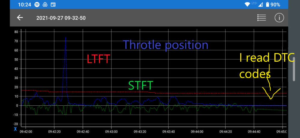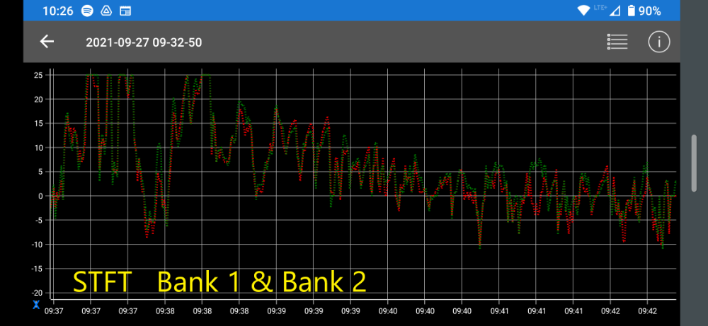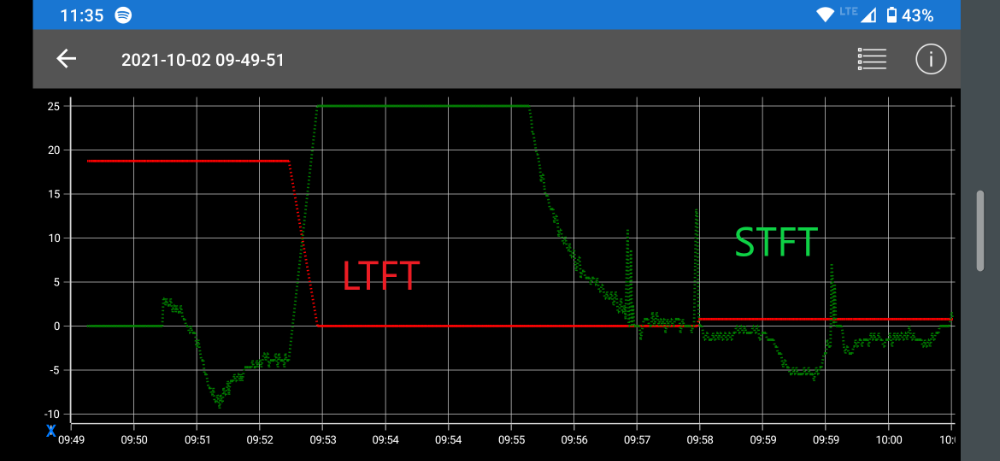 The commute log also shows that when the engine is cold, the STFT rises sharply and the LTFT rises. After some time, the STFT drops and the LFTF remains constant.