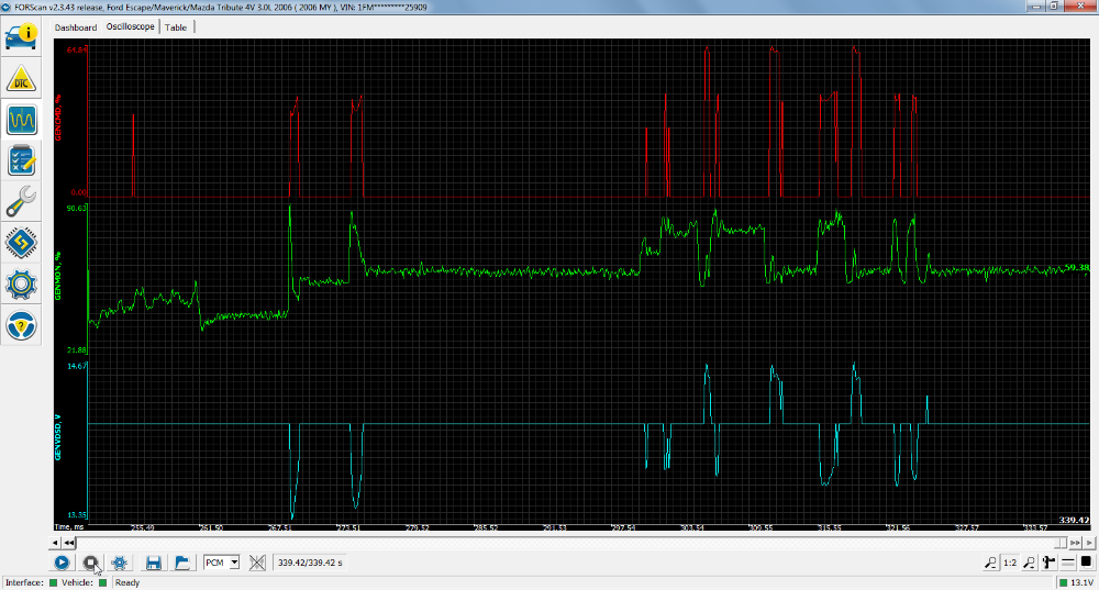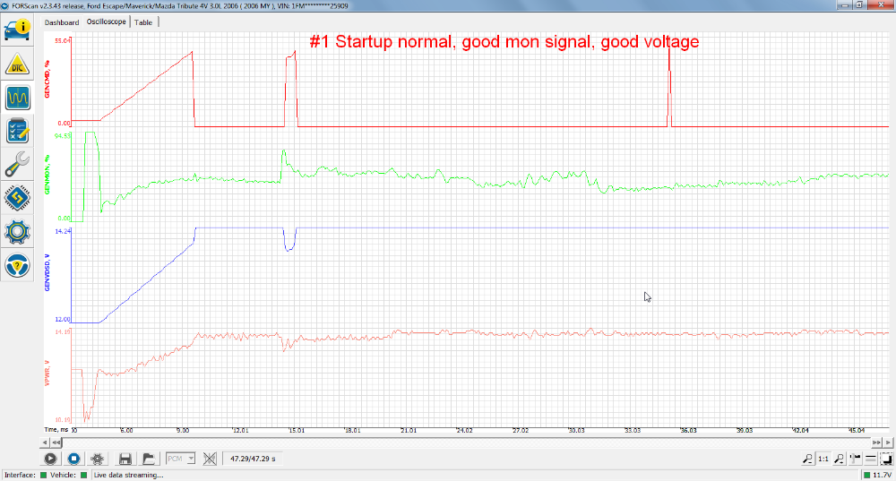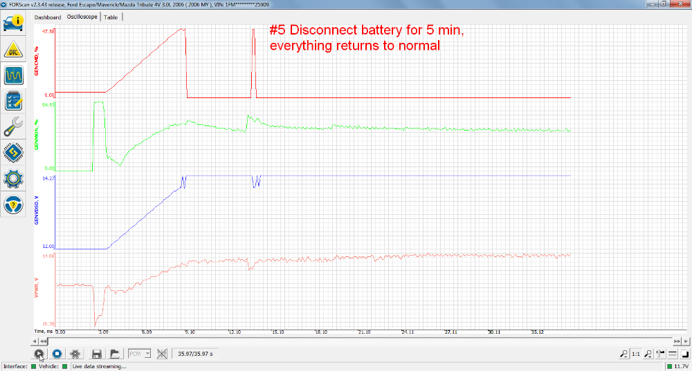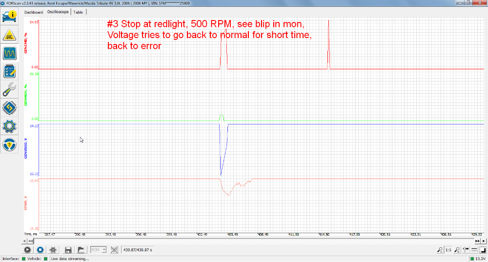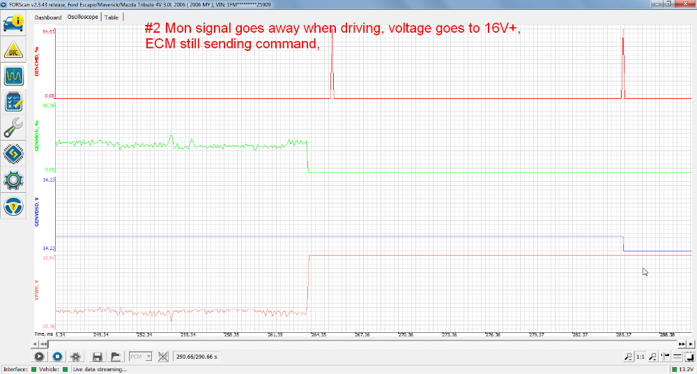 Took it for a drive, and in 10 min, same overcharge issue. Luckily close to home. Disconnected battery overnight, same trouble where it was good for 10 min idling in driveway, but when driving, lose GenMon signal and overcharge. Disconnected 2 hours, and worked fine. Sat in driveway idle, reving motor, turning on AC and lights, all good. Drove 10 min on highway, slowed down to turn around, and same thing. Pulled cable off for less than 5 min, and drove home with it fine. Here is a pic of Forscan when GenMon goes away according to Forscan and overcharge happens... This was at highway speed, slowing down to turn around, and then nothing.