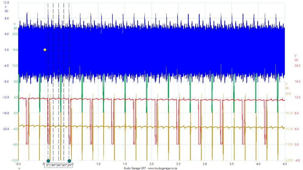 If my assumption about green being ignition and yellow being injection happens to be true then this would reflect a pretty common pcm strategy where at start up the system does not operate in a sequential injection order until cylinders are identified. Depending on model it may even not feature sequential injection.