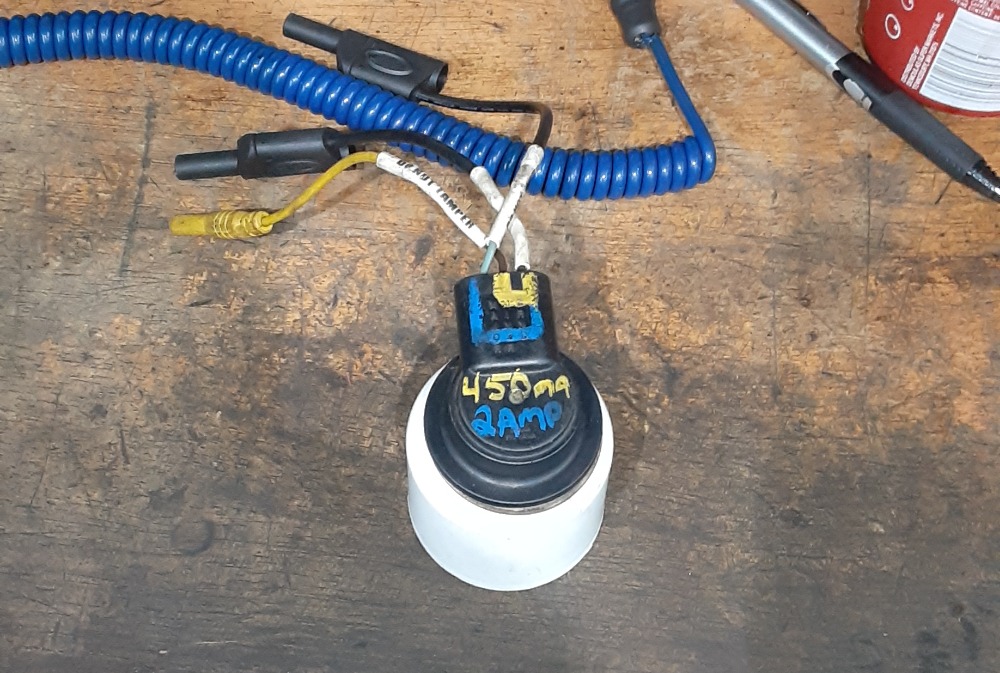 To test the circuit i plug a head lamp into the current carrying wires and operate the switch. If the circuit is good the lamp will light when you move the switch up or down.