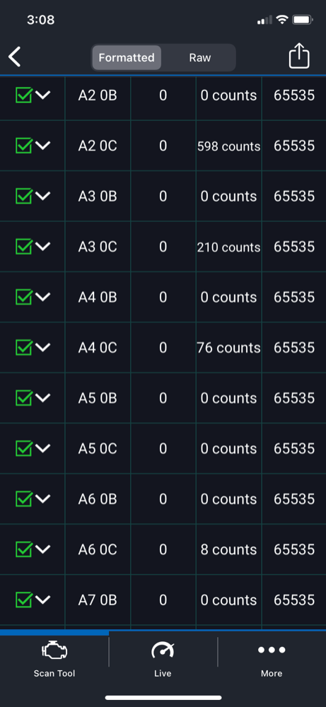 Here is the data from the Code 6 readings on the Blue Driver during a cold start/ warmup. The CEL came on and identified a P0300 misfire. As you will see on the data I have misfires all on the right bank with the biggest problem being cylinder #5.