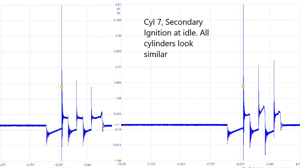 Fuel trims remain under 6%, so I don’t feel that it’s a fuel delivery issue. In fact, fuel trims on both banks are identical. I did notice slightly elevated fuel trims under load, so I cleaned the MAF sensor just for good measure. O2 sensors on both banks are working properly and voltage readings are also identical. There are no codes in memory, but I did catch the MIL flash once while test-driving it. I had a scan tool connected and a pending P0302 was stored. After the test-drive, the pending code cleared on its own. Mode 06 showed some misfire counts on Cyl 2 and Cyl 7. This vehicle has a vacuum-operated EGR system. Concerned about EGR gases possibly passing through at idle, I checked the EGR vacuum solenoid operation with a vacuum gauge and bidirectional control. It’s sealing at idle. Also disconnected the EGR tube that connects directly to the EGR valve, to verify if EGR valve wasn’t sticking slightly open at idle. Nothing wrong with the EGR system, Although I have access to advanced diag tools, I lack experience. I worked at a shop for a couple of months and did some diag work, but this one is kicking my butt. Data is pointing me towards a mechanical issue, but relative compression looks good. I don’t have enough data to call it a mechanical issue. I don’t have an in-cylinder pressure transducer either, so I went ahead and ordered a compression test kit. The multiple misfires were sidetracking me, but I think I need to zero in on this cylinder 7. I’m trying to gather as much data as possible. Anyone with experience with these 5.4 engines will be greatly appreciated. I've attached some waveform captures and videos.