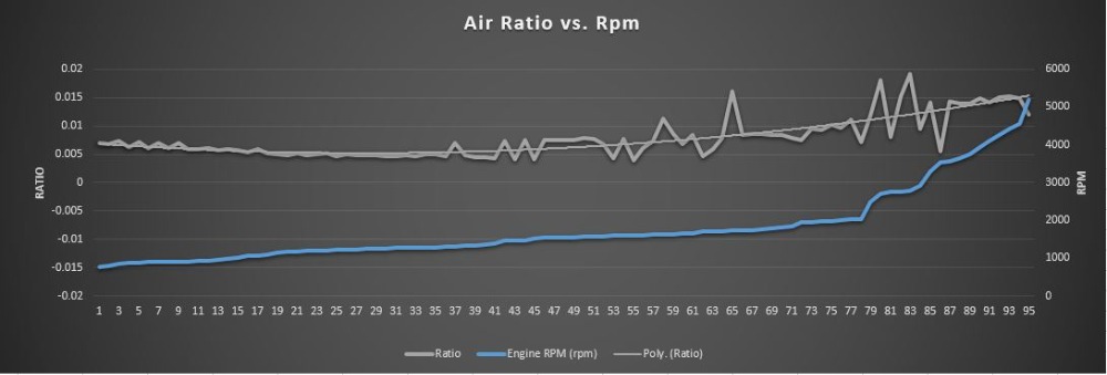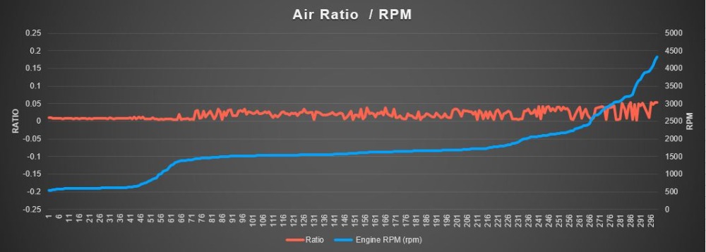 The Air Ratio is the Actual MAF reading divided by the RPM. We know that the air an engine inhales is proportional to its RPM. This ratio line should be perfectly straight across the entire RPM range of the engine. In the case of this Ford, it is.