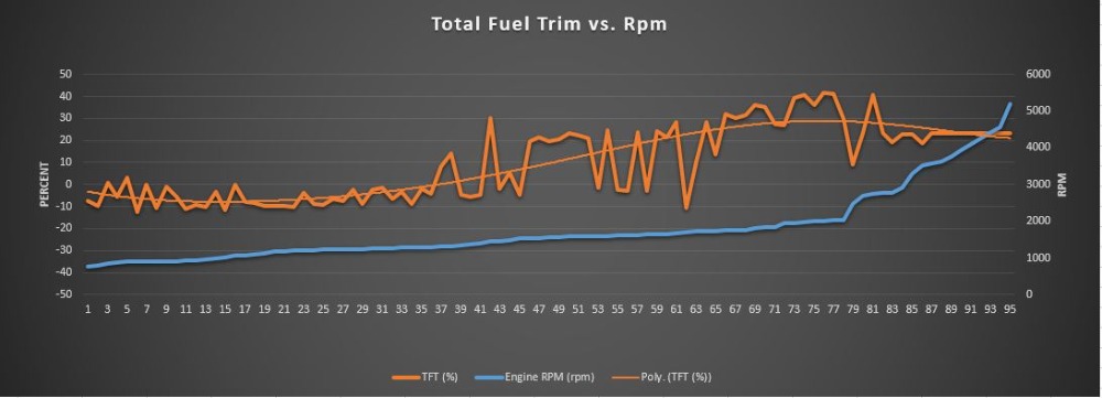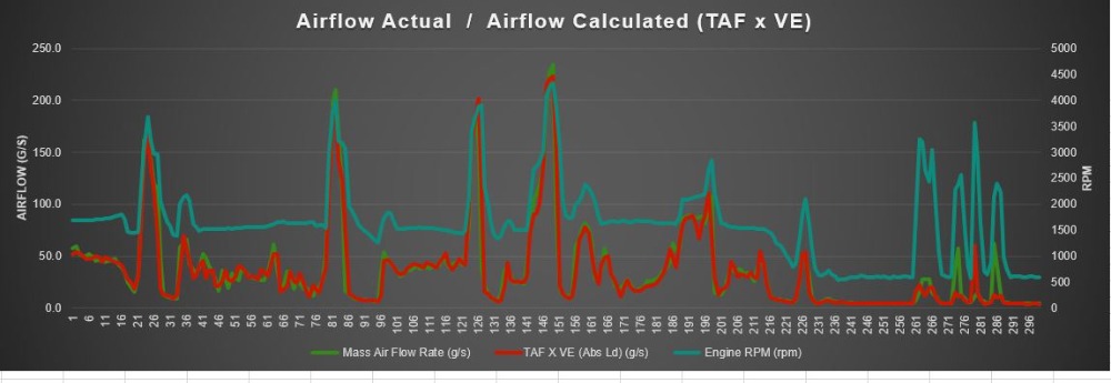 The above graph further solidifies the Air measurement was correct. What the engine can theoretically ingest matches what the MAF is reporting. This Theoretical airflow is calculated from engine rpm and size and multiplied by the Absolute Load (which is the Volumetric Efficiency). I have yet to use complicated airflow calculators that take into account Barometric Pressure and Temperatures; that's not to say they will never be required!