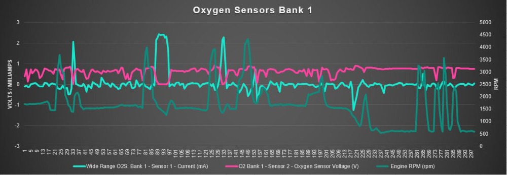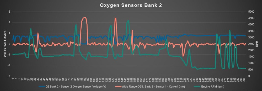 These Oxygen sensor graphs show the sensors are telling the truth. We can see some nice fuel cuts, and near the end of this test drive a few snaps and we can see a couple of short high oxygen storage capacity from the Catalysts. These Cats are in danger of raw fuelling, which makes Oxygen Storage Capacity testing not a good idea until the fuelling issue is addressed.