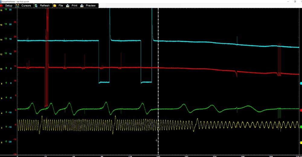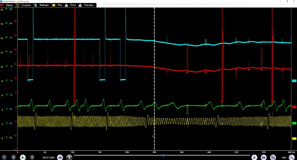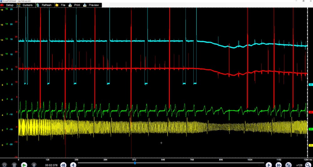 Tests: We verified that the VVT system is not having any issues and timing is correct at all times even when stalling. Using a lab scope we can see that the injector will fire followed by same injector firing way before it is supposed to. The initial injector firing is at the correct time, then there will be an extra firing (out of time), sometimes up to three in a row, this coincides with the hiccup. At the same time the ignition coils will stop firing, causing the hiccup/stall. During this event the cam and crank signals measured at the PCM are perfect. This also happens with both the cam sensor and solenoids unplugged.