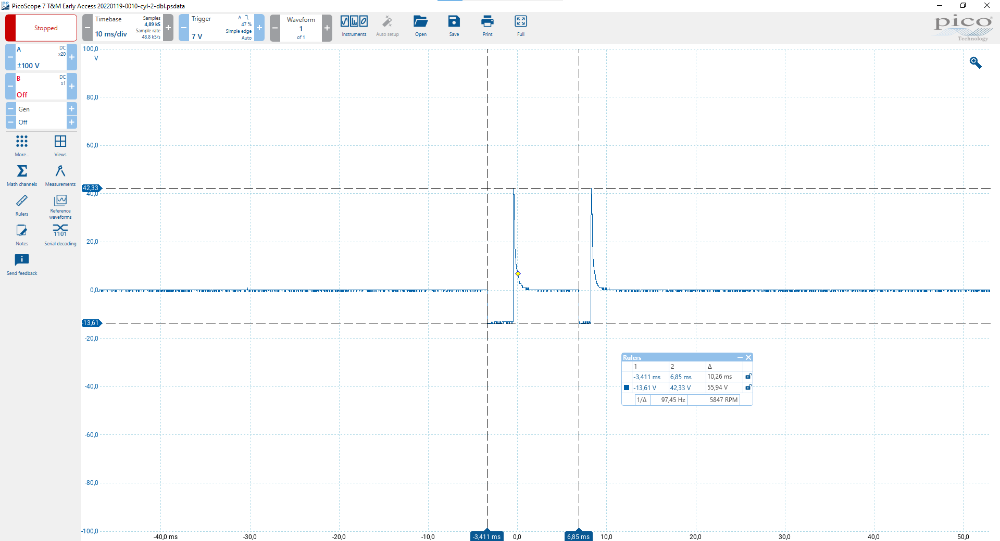When scoping the injectors, I got these waveforms (s. attachments), which show at first single - then suddenly appearing - double injector signals. These inconsistent signals seem to be in sync with the audible and perceptible misfires of the engine when running (here: at idle). They appear spontaneously on all cylinder with the exact pattern.