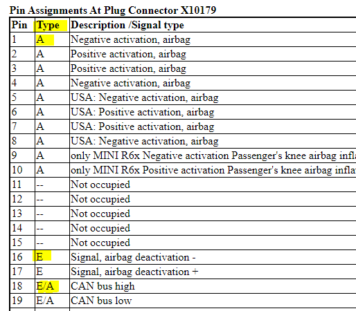 Hi, just signed up to Mitchell DIY for information on my Mini Cooper, while the organization of the information is not great it sure beats having no information. Alldata looks nicer but their DIY service does not include BMW/Mini for some reason. Anyhow, when looking at the connector pin assignments page on Mitchell I noticed there is a column labeled 'Type' with designations such as 'A', 'E', etc. I would guess that this indicates what type of signal that is, i.e. a switched ground source, a sensor input, etc. but I can find no table that explains these codes.