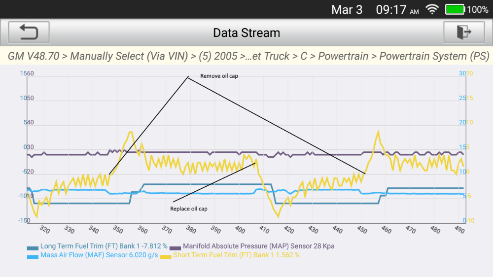 bad fuel trims? Removing the oil cap seems to get the fuel trims right so would that further reinforce the idea that there is