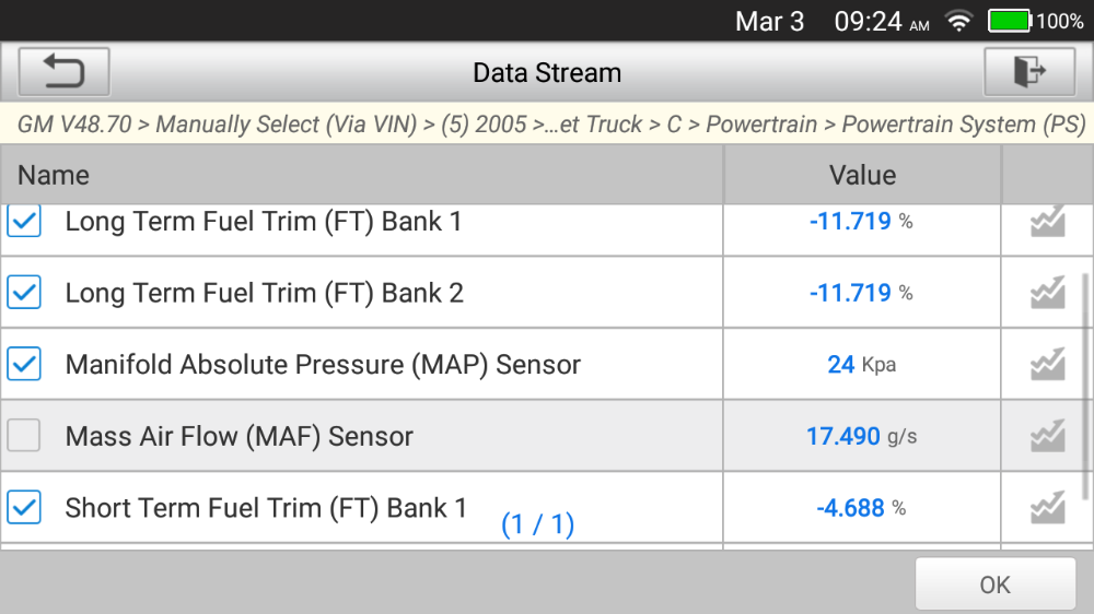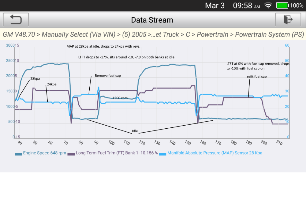 The MAP sensor reads at 28kpa at idle - I'm used to seeing around 34kpa on most vehicles.