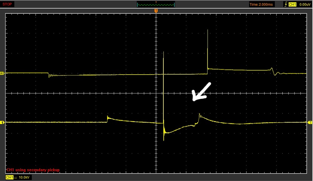 The whole waveform is inverted, you can see this also when the coil is turned on. The firing voltage seems to reach around 8 to 10 kV, as you kV/div shows 10kV. You may get confused by the long spike that looks like a normal firing event/break dow voltage but probably is just an interference/fly back. Otherwise you´d have more than 35kV and this coul not make for the 2 ms burntime.