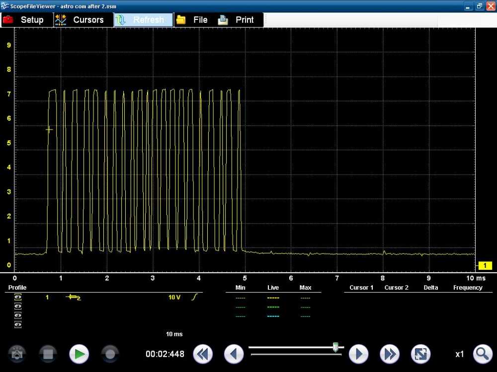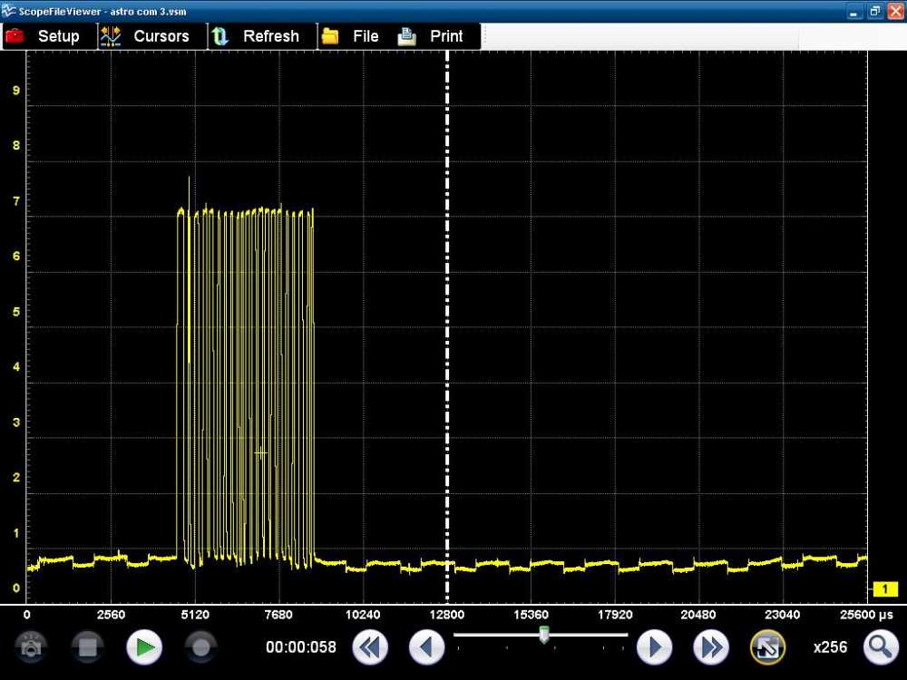 KOEO, KOER (no loads & all accessory loads) 10v scale, 50ms sweep ( :lol: ) all I saw was tightly packed 0v-7v square waves with longer periods of low voltage in between signals. So, nothing remarkable, no real noise or hash. I could be wrong, but it looks about what I expected to see
