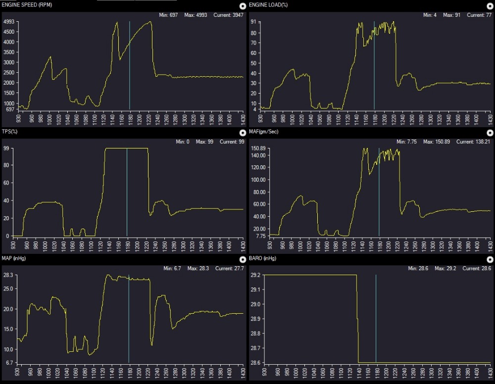 At WOT, the BARO is 28.6 inHg, and the MAP is around 27 inHg. That'd translate to around 1 inHg vacuum, pretty normal for a WOT run. Earlier in the capture, the engine is idling with a BARO of 29.2 and a MAP of 13.2. That works out to 16 inHg, which isn't surprising considering this Blazer had a dead misfire. :lol: