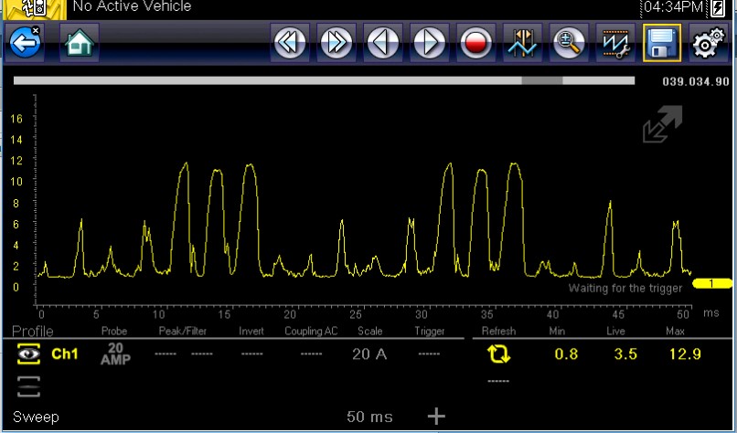 For example, this is the current waveform from a failed fuel pump motor. Several of the commutator segments are clearly open.