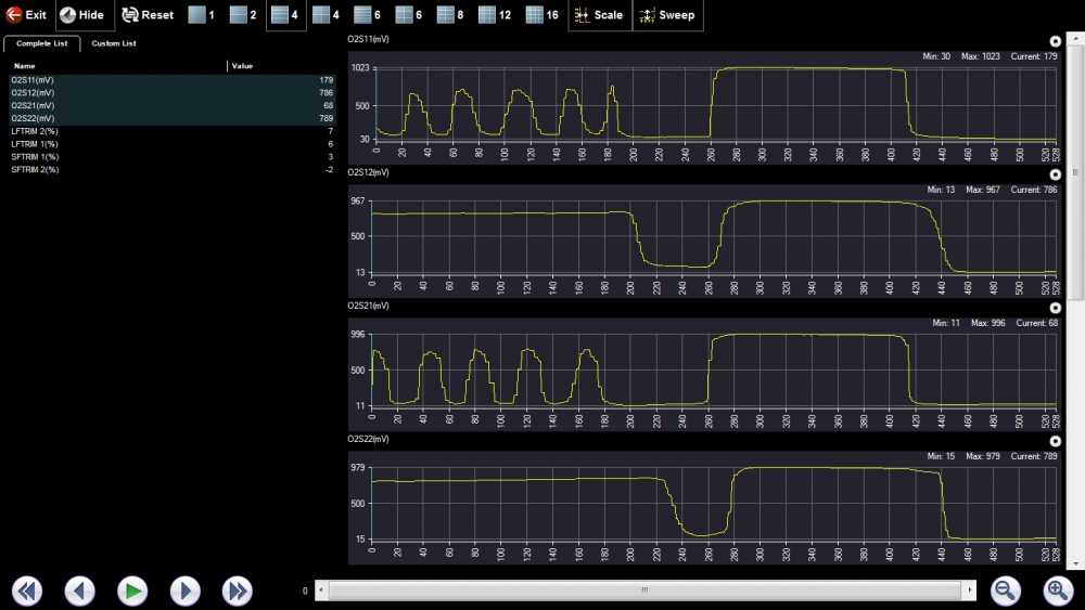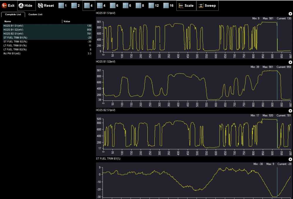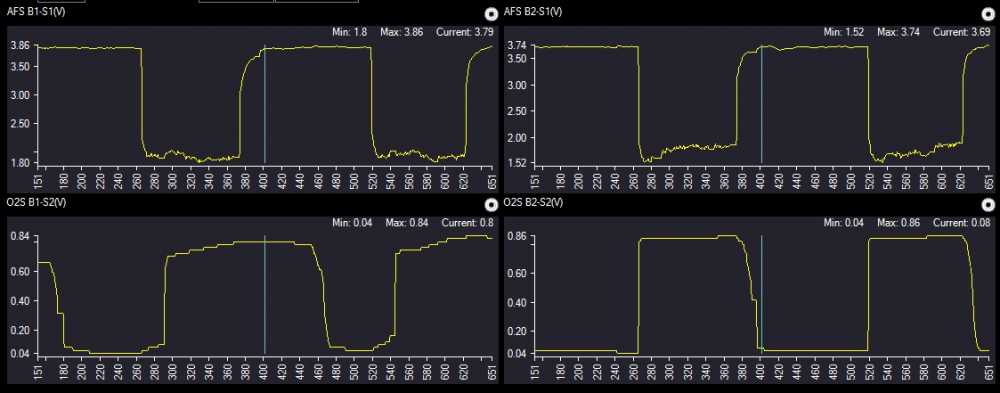 I just happened to look at an '06 Tacoma with a P0430 recently, here's what the sensors looked like while jamming the mixture rich and lean: