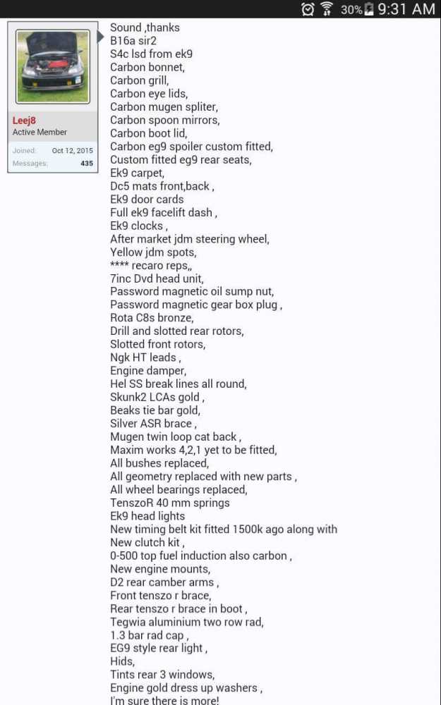 That's some spec to what iv done so fare , I went from d16y8 sohc vtec too b16a dohc vtec with 4.7fd lsd , Iv changed my dash and all other interior parts also , like facelift ek9 dash and so on , really this has been my pet project for few years now and I'm looking to do some dataloging on crome or hondata in near future hence why I'm here in case I run into problems, iv followed skannerdanner for few years on YouTube